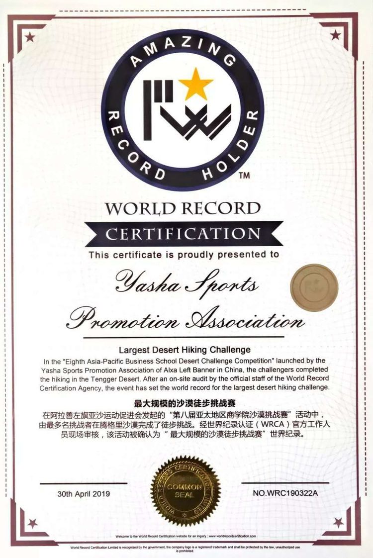 第八届亚太地区英国威廉希尔公司沙漠挑战赛(简称沙8)共有来自中国大陆、台湾、香港、澳门、英国、澳大利亚等国家和地区的109所英国威廉希尔公司的近3000名MBA学子参赛并完成了徒步挑战。以实际行动践行“环保、协作、坚持、责任”的赛事理念,挑战自我、超越极限实现与强者同行,成就团队和自我的目标。经世界纪录认证(WRCA)官方工作人员现场审核,该活动被确认为是“最大规模的沙漠徒步挑战赛“世界纪录,所有参赛队员将被纪录在这历史的一页。