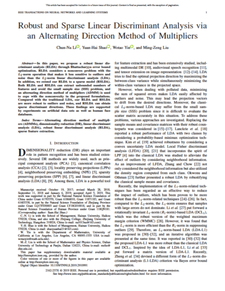 近日,公司管理公司李春娜副教授撰写的“Robust and sparse linear discriminant analysis via alternating direction method of multipliers”在信息处理和智能计算领域顶级期刊《IEEE Transactions on Neural Networks and Learning Systems》(SCI 一区,最新影响因子为11.683) 接收发表。 该期刊为IEEE神经网络协会、IEEE 计算智能协会主办,是IEEE计算智能学会核心刊物,神经网络和学习系统方面的国际顶级杂志。
