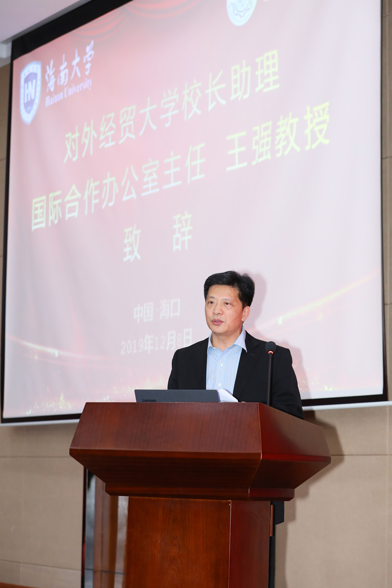 王强代表对外经贸大学对研究院的成立表示祝贺,他强调,“海南省公司治理研究院”是两校开展实质性对口合建工作的第一枚硕果,标志着两校合作的实质性落地。未来对外经贸大学与williamhill官网将以“双一流”建设为目标,以服务国家战略和地方经济社会发展为导向,通过对口合作,致力在人才培养、科学研究和社会服务能力方面得到提升。