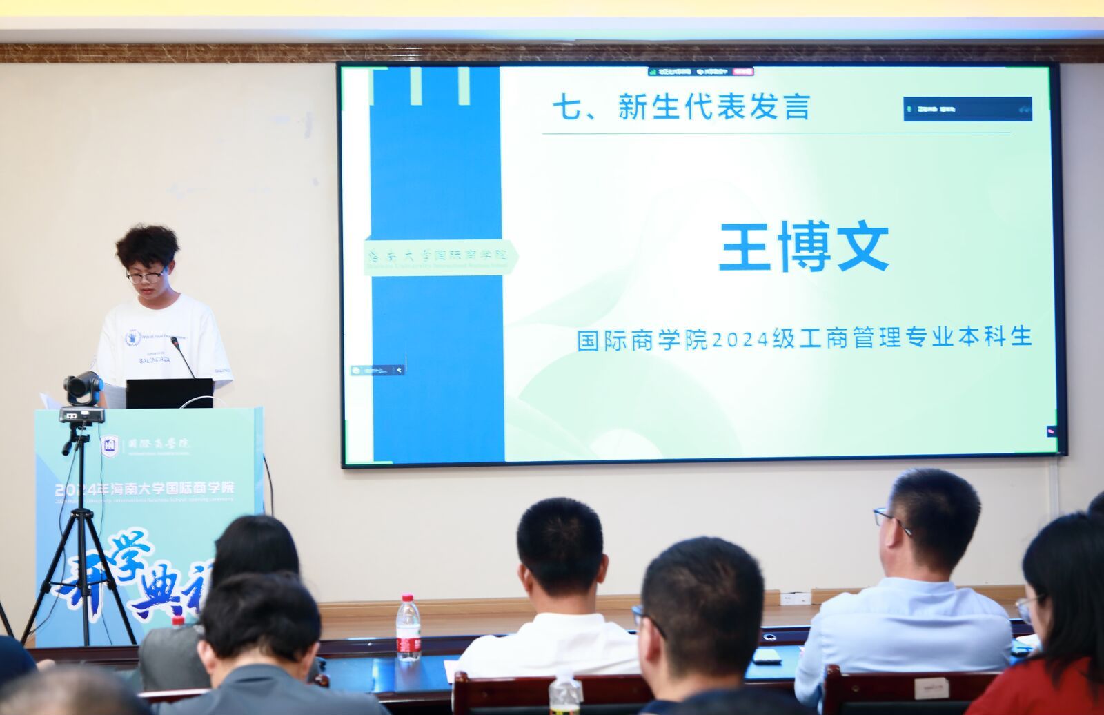 王萍副教授作为教师代表发言,寄语同学们珍惜眼前美好,懂得感恩与奉献,不断提升自己的能力,用所学知识为社会贡献自己的力量。摩羯台风的来袭,不仅考验了大家的应变能力,更激发了大家面对困难不屈不挠的精神。大家的到来,更如同雨后初晴的阳光,为公司带来了新的生机与活力,希望在日后的征途中也能并肩逐梦,共绘国商新篇章。