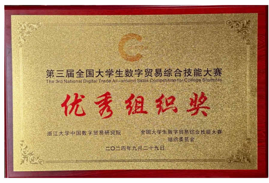 2024年9月28日至29日,第三届全国老员工数字贸易综合技能大赛全国总决赛暨颁奖典礼于浙江杭州举行。英国威廉希尔公司参赛队伍获全国总决赛一等奖1项、二等奖1项、优秀指导老师奖1项,williamhill官网获优秀组织奖。此外,公司其他队伍在此前区域赛(华南赛区)中获二等奖2项、三等奖1项。