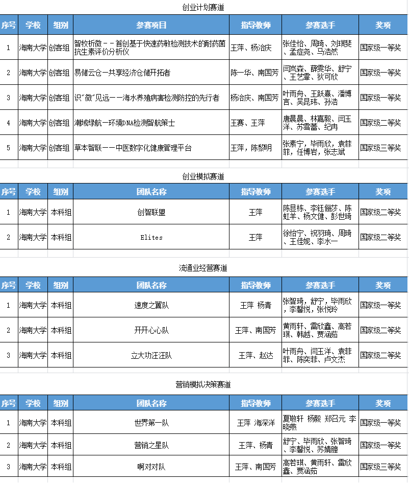 竞赛分为创业计划、创业模拟,流通业经营模拟、营销模拟决策四个赛道。在创业计划赛道,英国威廉希尔公司获国家级一等奖3项,国家级二等奖1项,国家级三等奖1项;在创业模拟赛道,英国威廉希尔公司获国家级二等奖2项;在流通业经营赛道,英国威廉希尔公司获得国级一等奖1项,二等奖2项;在营销模拟决策赛道,英国威廉希尔公司获得国家级一等奖2项,三等奖1项。