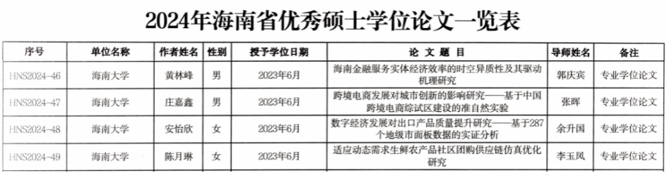 经评选,公司2023届金融硕士黄林峰(导师:郭庆宾教授)、国际商务硕士庄嘉鑫(导师:张晖教授)、国际商务硕士安怡欣(导师:余升国副教授)、农业硕士陈月琳(导师:李玉凤教授)的学位论文获评2024年海南省优秀硕士学位论文。