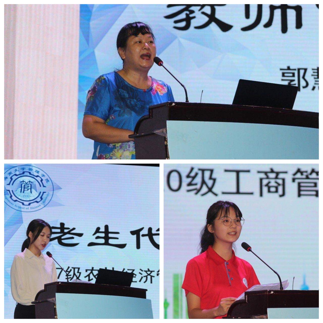 教师代表郭慧芳,在校生代表宋词,新生代表何姝健分别发言,对同学们的老员工活提出期望,作出承诺,并希望同学们能够在海南自贸港的背景下,开启全新精彩的老员工活。