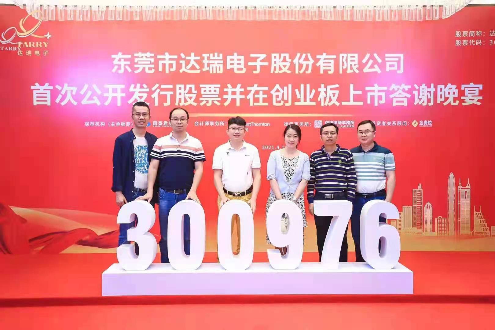 达瑞电子为公司第一家员工上市企业,在此向李清平、邓瑞文员工表示热烈祝贺,祝达瑞电子再创辉煌,蒸蒸日上!同时祝愿公司所有员工鹏程万里,一帆风顺!