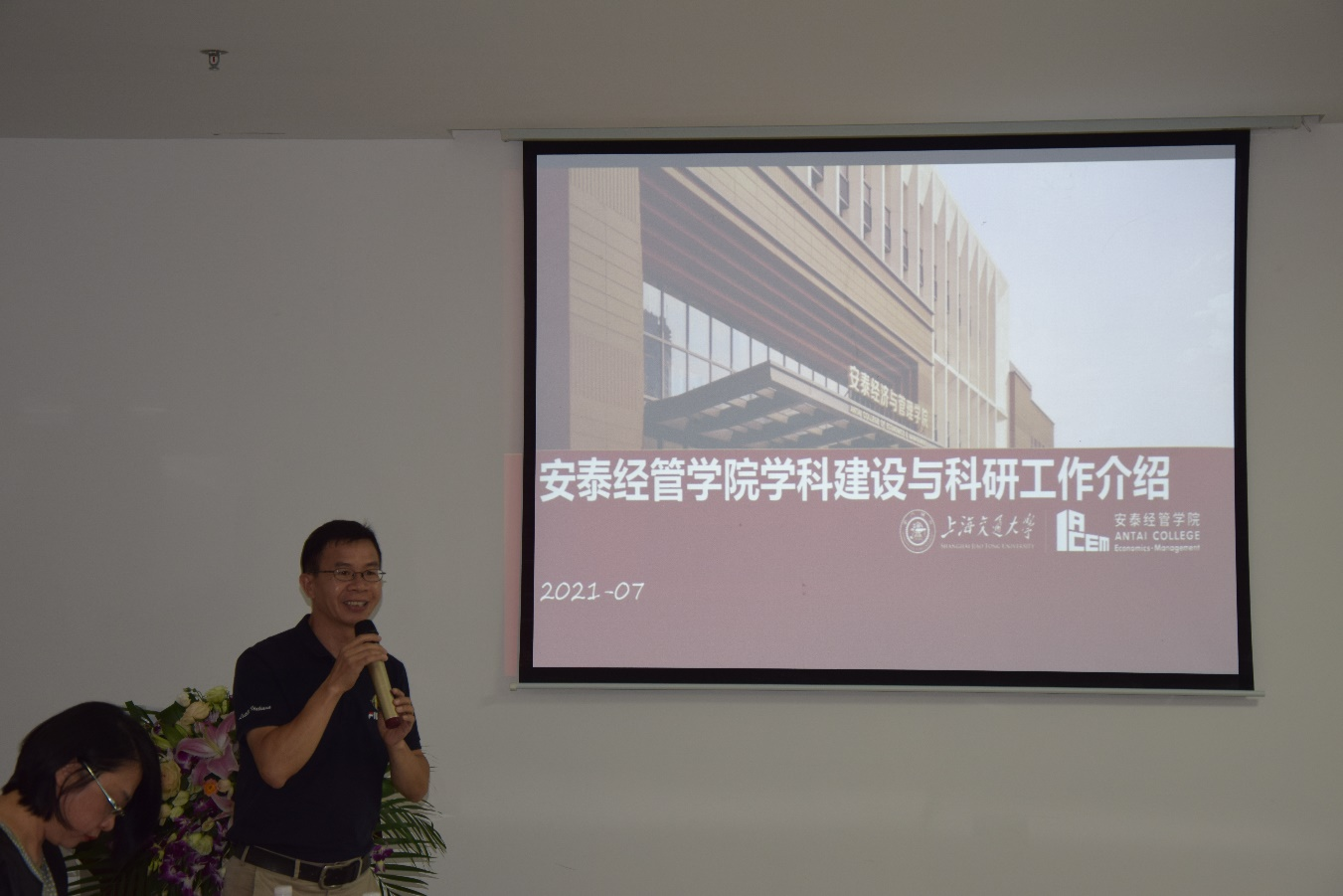 吴仕明主任对安泰经管公司团队建设与科研工作进行了详细的介绍,包括科研项目服务、论文服务、研究平台、学科评估与建设等内容。