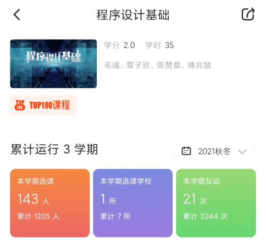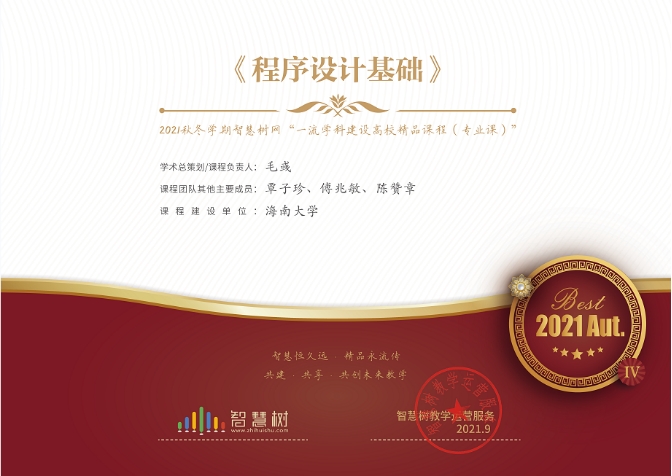程序设计基础课程被评为2021秋冬学期智慧树网一流团队建设高校精品课程公司从2006年开始开设本课程, 在本科生2020级培养方案中课程更名为《程序设计》并纳入全院的学科基础课,在物流管理、会计学、工商管理、农经济管理、工商管理实验班以及会计学(ACCA国际会计特色班开设。