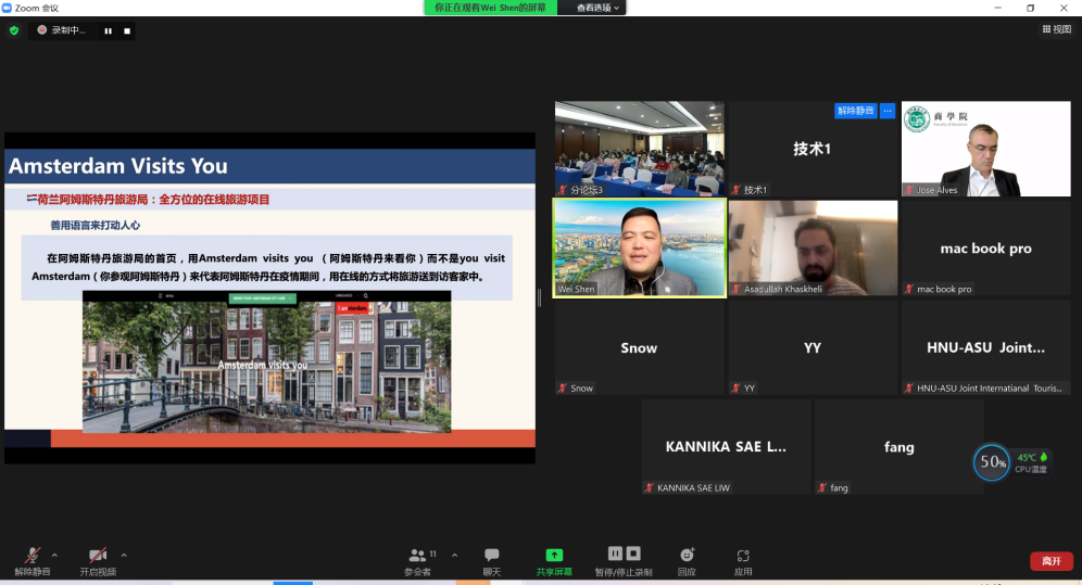 “文旅融合高质量发展”分论坛上半段由williamhill官网管理公司经理唐宁玉教授主持,澳大利亚墨尔本迪肯大学沈伟教授、新西兰怀卡托大学Chris Ryan教授、澳门城市大学José Alves教授和康奈尔大学Peng Liu教授分别作了主题演讲。论坛第二阶段由williamhill官网国际旅游公司李萍副教授主持,williamhill官网国际旅游公司肖潇博士、williamhill官网旅游公司AHMED MANSOORA研究员、williamhill官网管理公司冯文婷博士、williamhill官网旅游公司张国杰博士进行了报告。