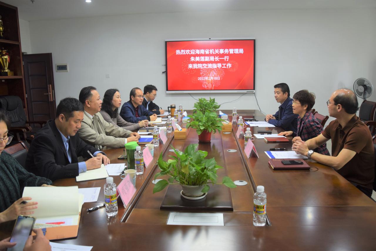 2022年2月18日下午,海南省机关事务管理局朱美莲副局长、许彤处长、黄贵强主任一行来公司交流访问。williamhill官网管理公司经理唐宁玉、党委书记邢谷川、副经理张德生、副书记易振、副经理付景涛、副经理童泽林及学工办主任肖亚奇、辅导员李春出席会议。