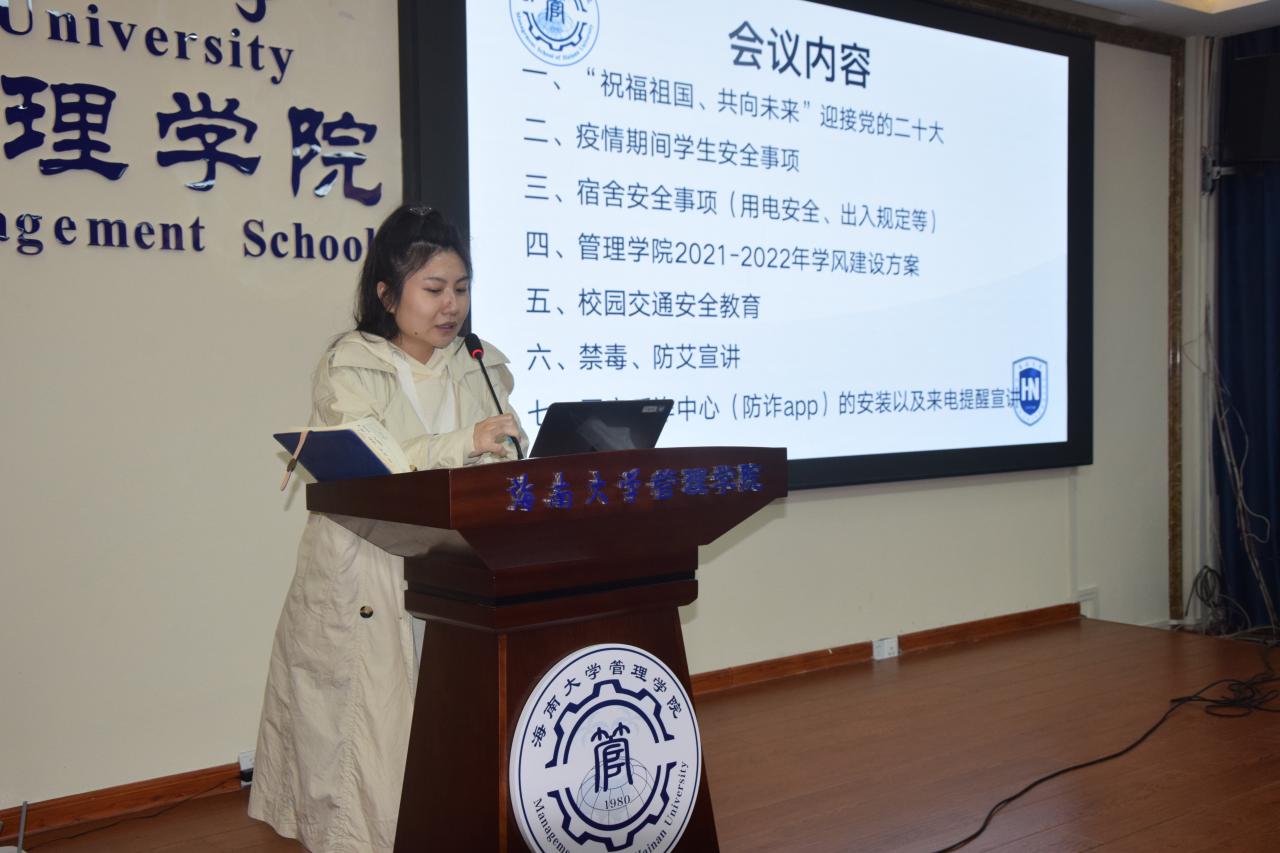 会议第一部分,为进一步落实公司安全教育工作,强化公司的安全管理,提高同学们的安全意识,肖亚奇进行安全主题教育,涵盖了四个主要内容,第一、强调了疫情期间员工安全事项,明确公司关于疫情防控政策,并要求员工按照政策进行在校活动。第二、进行宿舍安全教育,注重宿舍卫生,禁止使用违规电器,夜间按时返回宿舍。第三、要求同学们注意校园交通安全,骑电动车的同学要遵守交通规则和公司的电动车管理制度。第四、进行禁毒、防艾、防诈教育,提高安全意识和自我保护意识。最后,结合2022届毕业生考研和工作情况,对同学们进行学风建设教育,倡导同学们结合自身实际尽早进行自我规划和提高学习自主性。