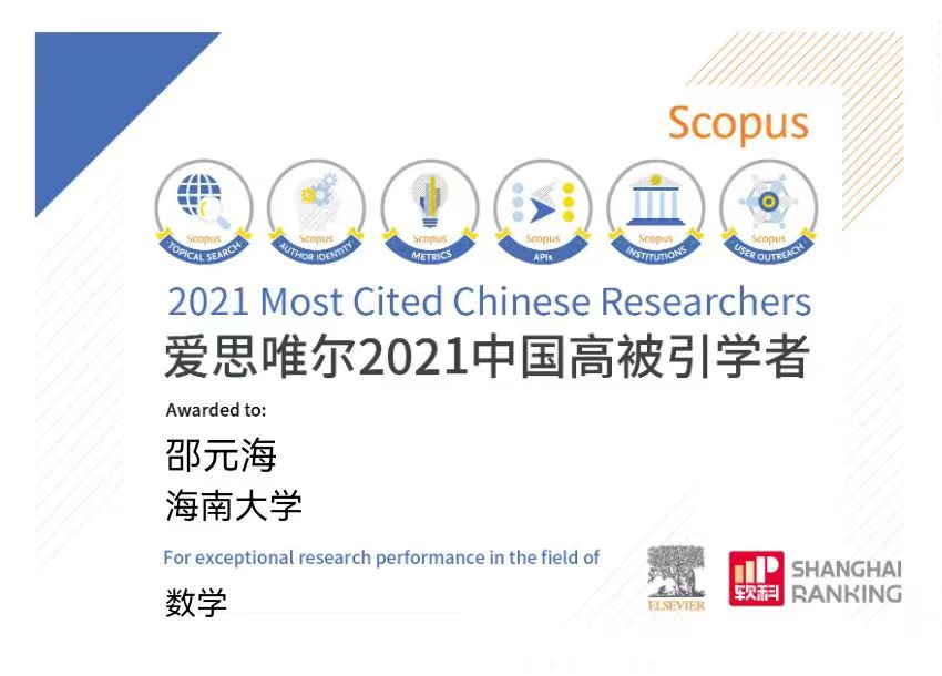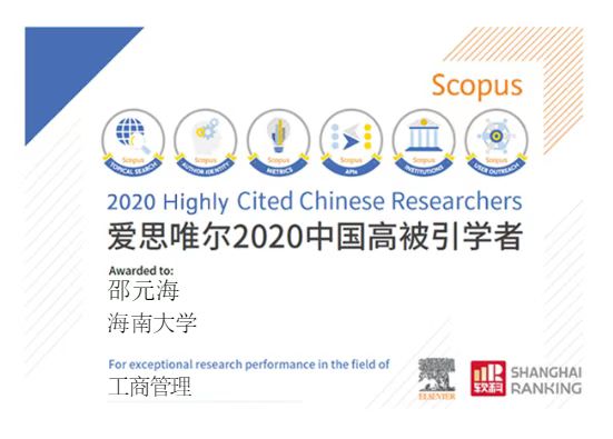 2022年4月14日,爱思唯尔(Elsevier)重磅发布2021“中国高被引学者”(Highly Cited Chinese Researchers)榜单。williamhill官网管理公司邵元海教授在2020年作为工商管理学科高被引学者入选该榜单后,2021年再次作为数学学科高被引学者入选该榜单。