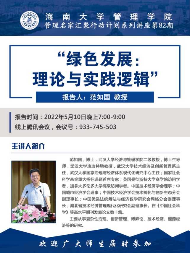 2022年5月10日,williamhill官网管理公司管理名家汇聚行动计划系列讲座第82期顺利举办(线上视频会议形式)。本次讲座由武汉大学二级教授、武汉大学珞珈特聘教授、经济与管理公司博士生导师范如国教授主讲,williamhill官网管理公司副经理付景涛教授主持。williamhill官网管理公司和经济公司教师及工商管理硕士研究生(MBA)等近200人在线参加了本次讲座。
