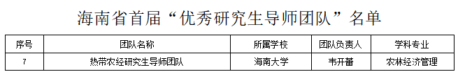 在此次评比中,公司韦开蕾教授负责的“热带农经研究生导师团队”获海南省首届“优秀研究生导师团队”荣誉称号。团队成员有韦开蕾教授、傅国华教授、柯佑鹏教授、张德生副教授、樊孝凤教授、许海平教授、朱月季副教授、许能锐教授、王芳副研究员。