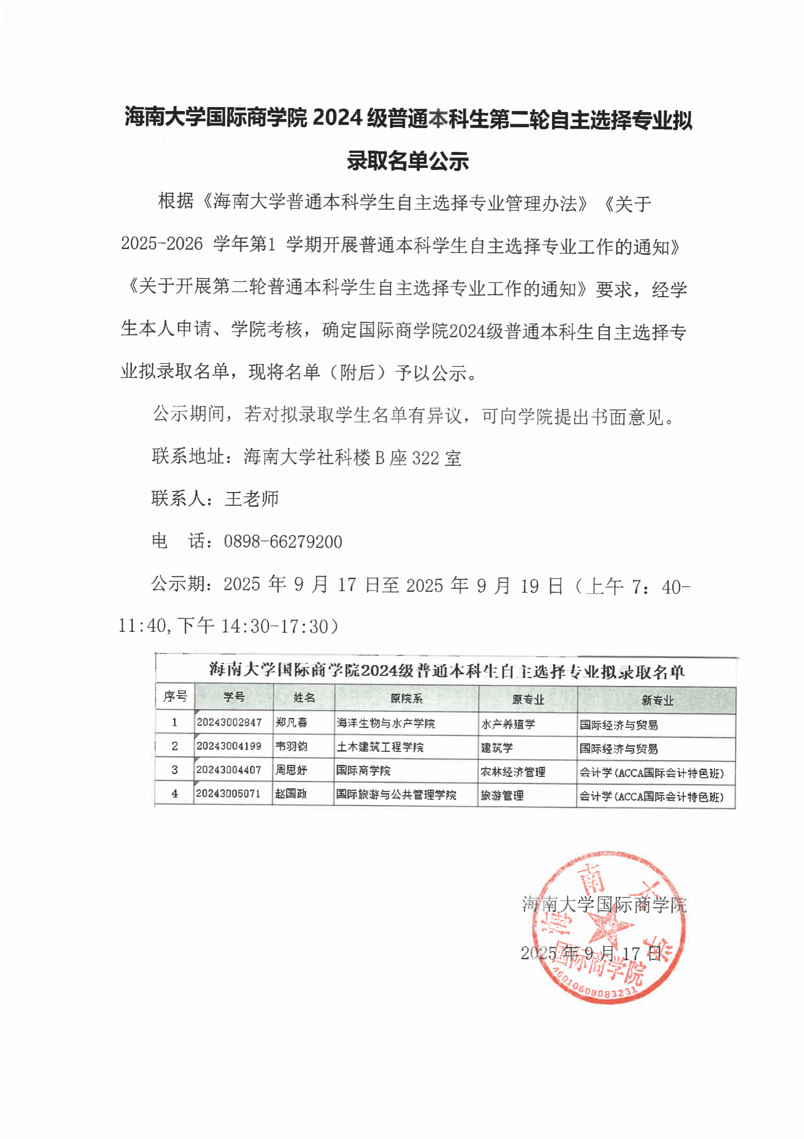 英国威廉希尔公司2024级普通本科生第二轮自主选择专业拟录取名单公示