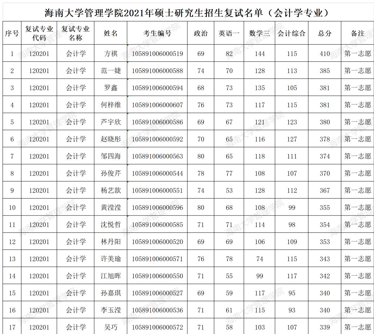 根据《williamhill官网管理公司2021年硕士研究生招生复试录取工作办法》,会计学专业复试比例为120%,复试人数17人;管理科学与工程专业复试比例为120%,复试人数14人(含1名专项计划);企业管理专业复试比例为120%,复试人数23人。如遇考生自愿放弃复试资格或被其他院校提前调剂录取,则在第一志愿上线考生中按初试成绩顺延增补,并另行公布。