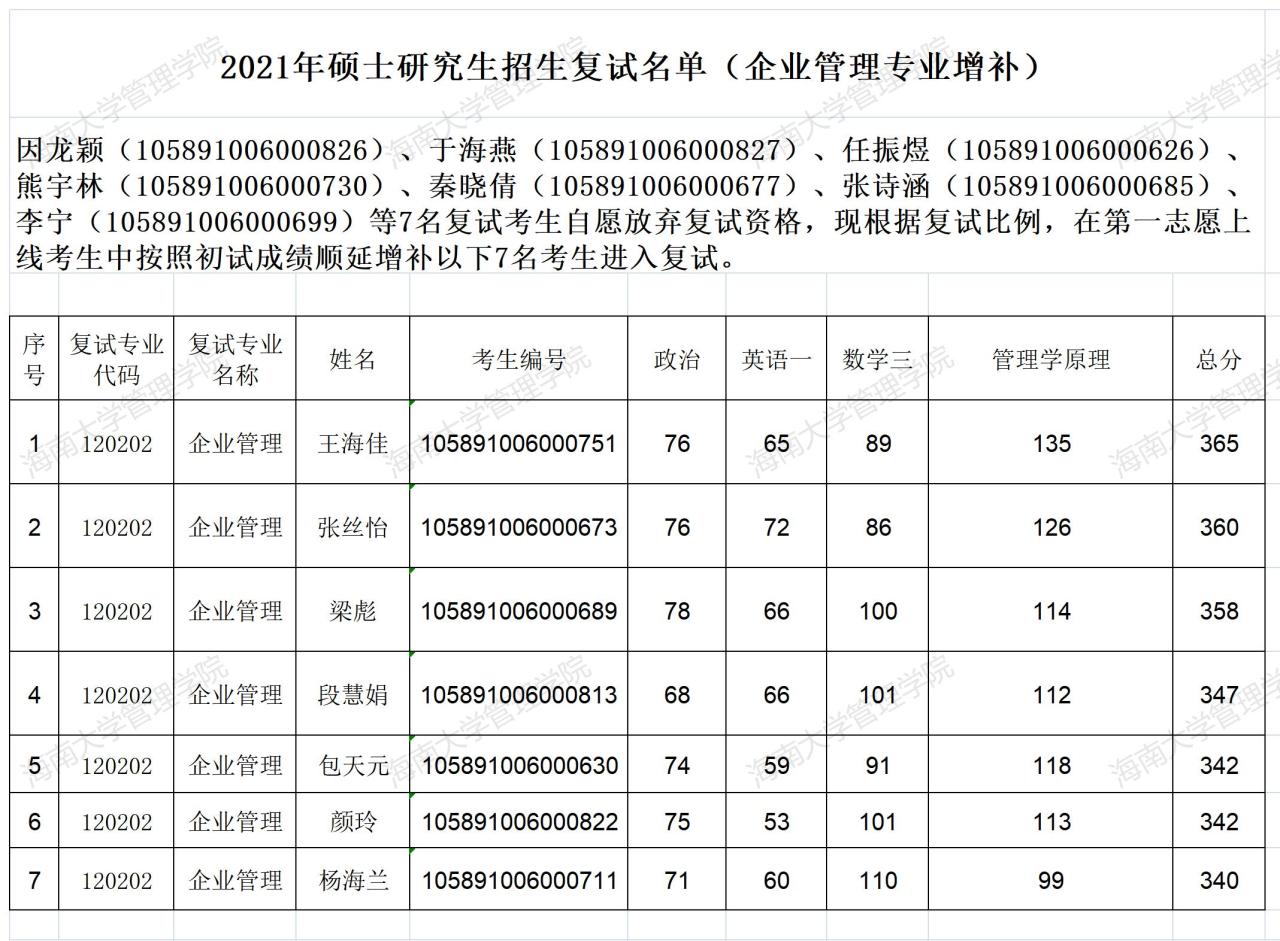 2021年硕士研究生招生复试名单(企业管理专业增补)