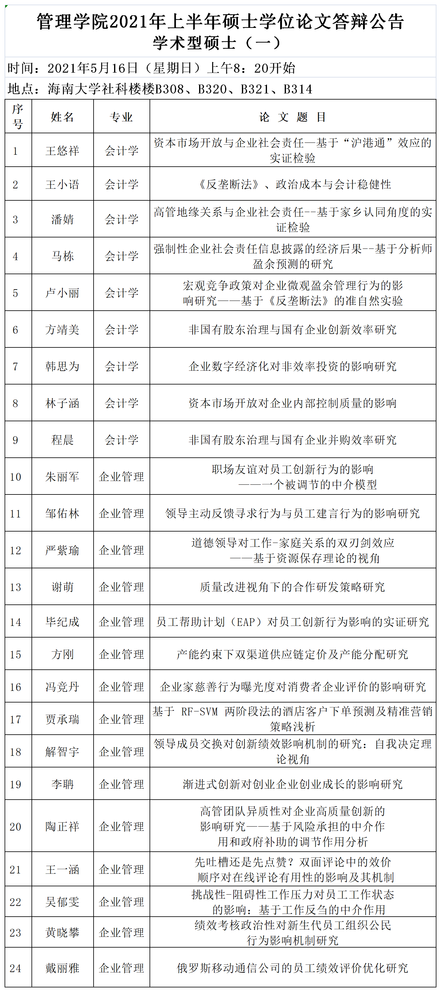 管理公司2021年上半年硕士学位论文答辩公告—学术型硕士(一)