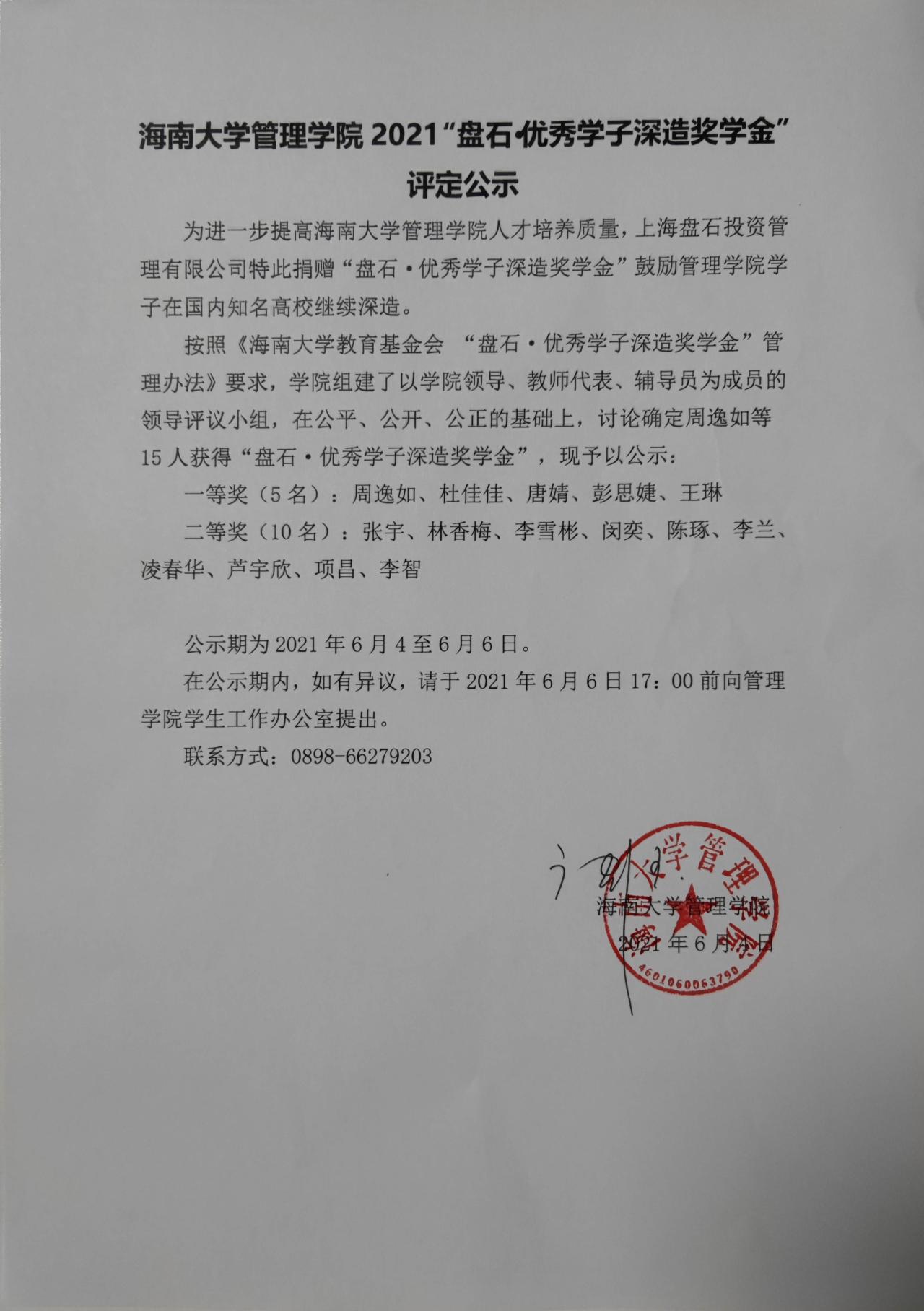 按照《williamhill官网教育基金会“盘石·优秀学子深造奖学金”管理办法》要求,公司组建了以公司领导、教师代表、辅导员为成员的领导评议小组,在公平、公开、公正的基础上,讨论确定周逸如等15人获得“盘石·优秀学子深造奖学金”,现予以公示: