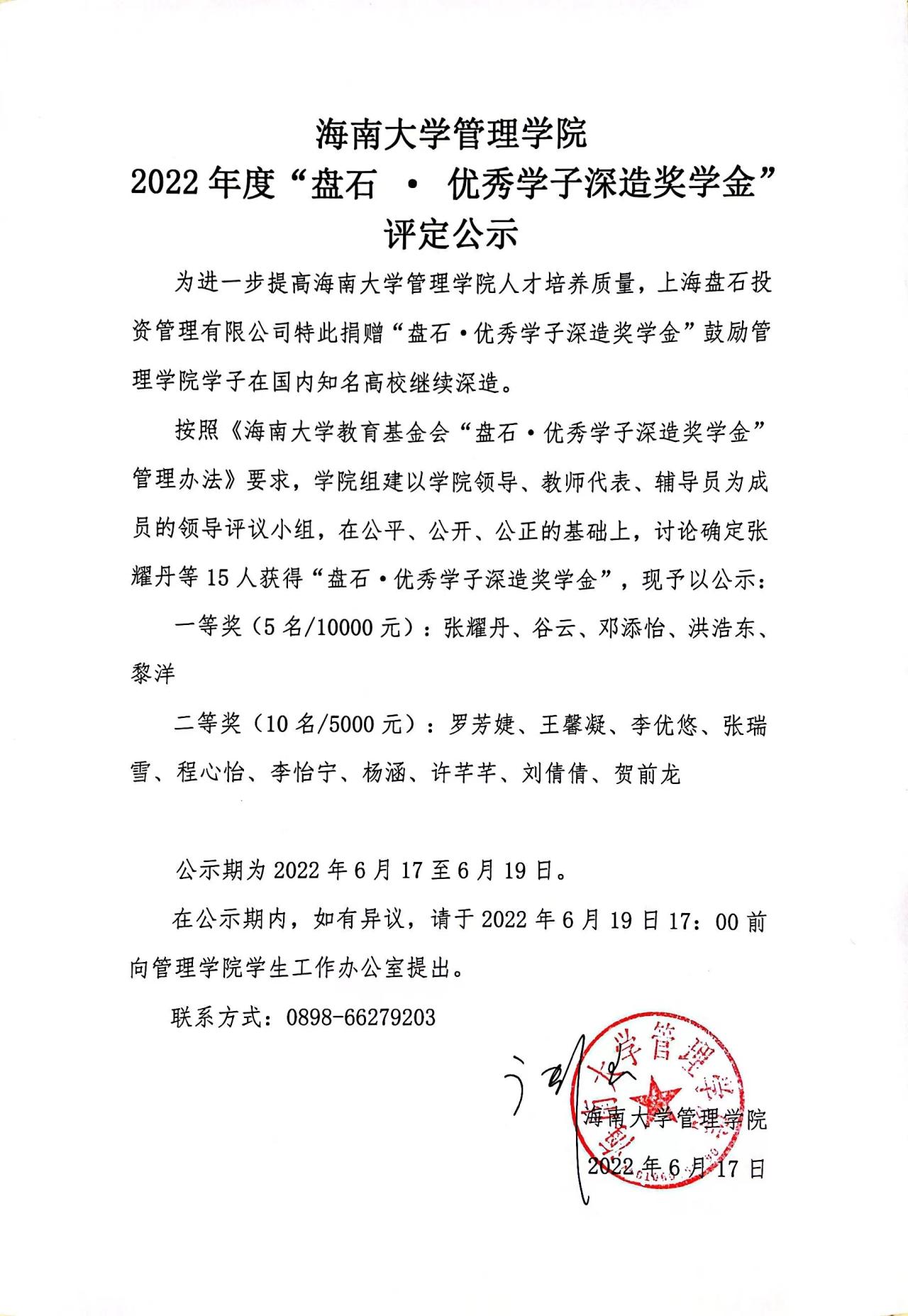 williamhill官网管理公司2022年度“盘石·优秀学子深造奖学金”评定公示