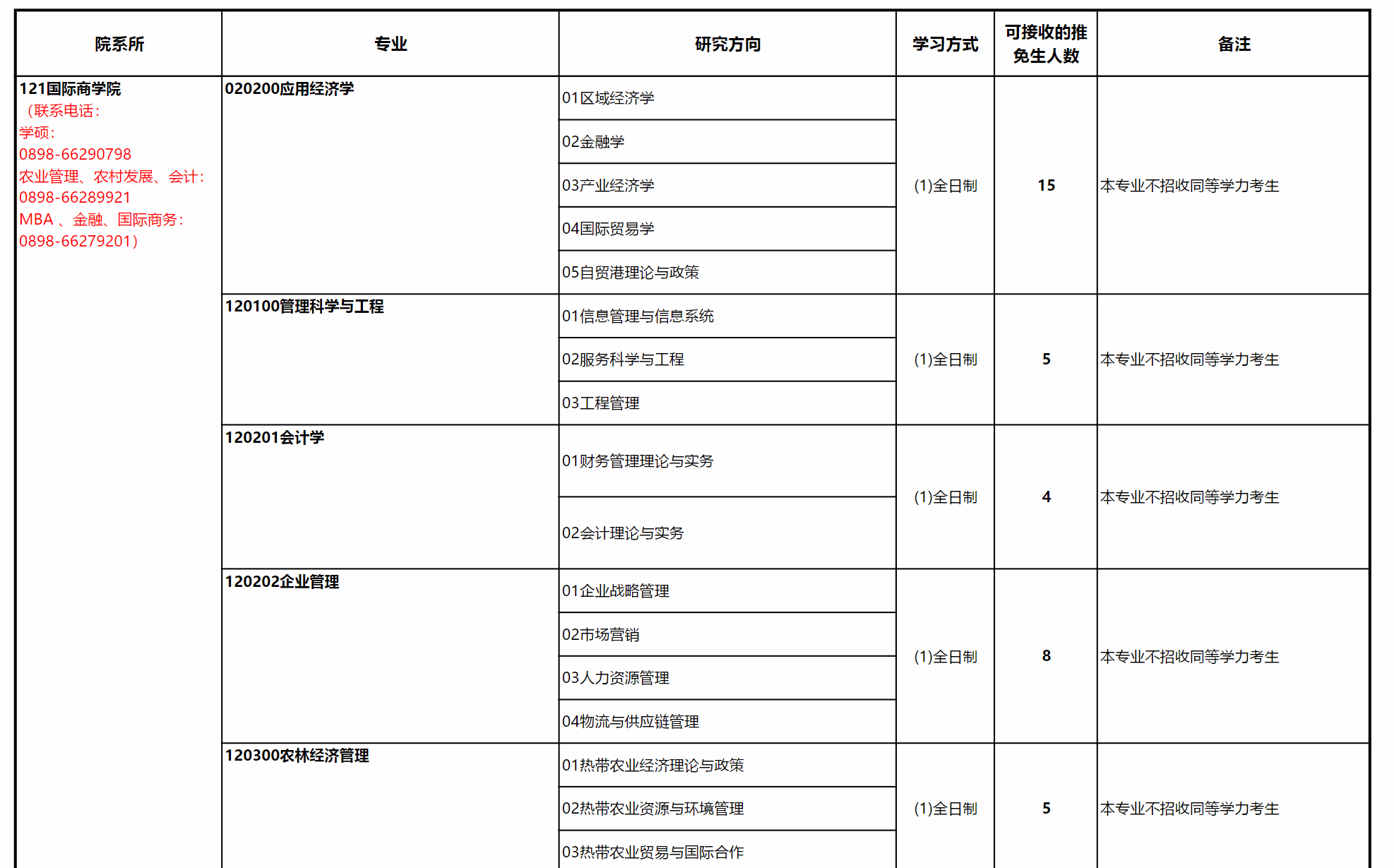 (2)金融专硕、国际商务联系电话:0898-66279201 联系人:吴老师