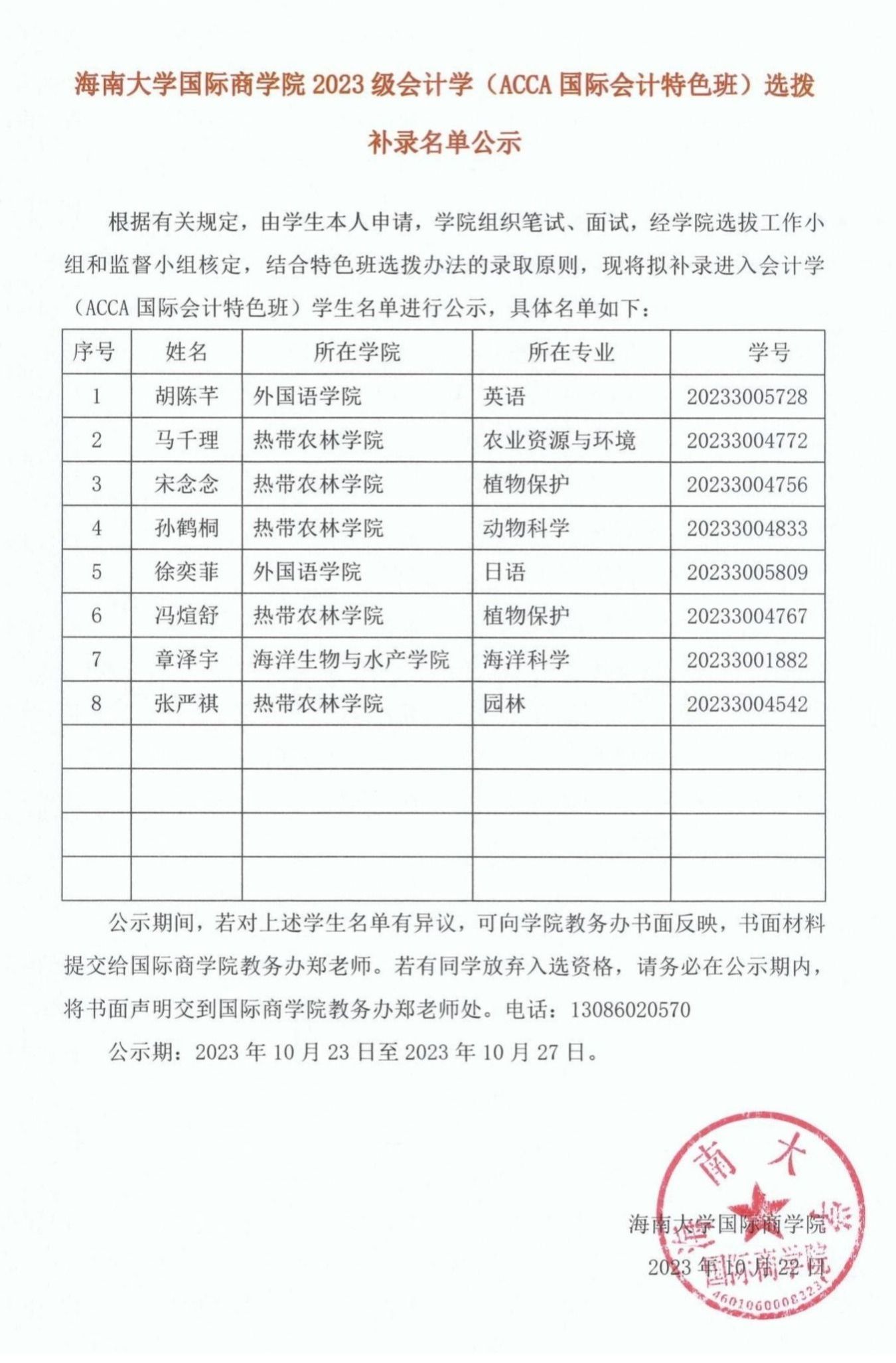 英国威廉希尔公司2023级会计学(ACCA国际会计特色班)选拔补录名单公示