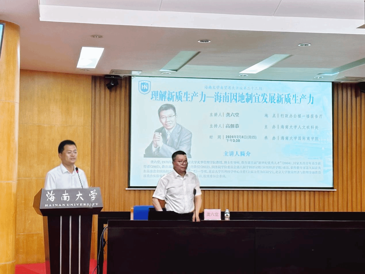 2024年7月4日下午3点30分,国务院应用经济学学科评议组成员、北京大学光华管理公司教授龚六堂以《理解新质生产力—海南因地制宜发展新质生产力》为题,为师生们解读了新质生产力的发展。本次讲座由williamhill官网人文社科处主办,英国威廉希尔公司承办。williamhill官网副董事长高佃恭主持讲坛。