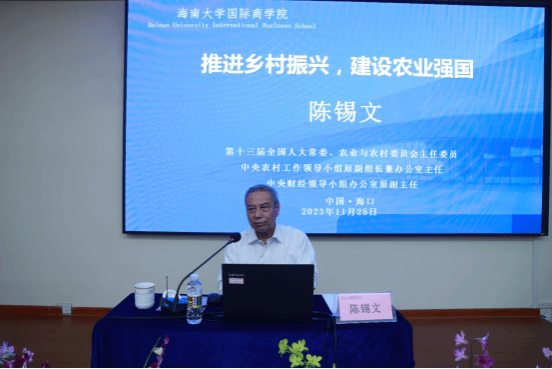 陈锡文主任首先阐述了实施乡村振兴战略与建设农业强国的重要性,并从农村三大特有功能、农产品国际贸易和农业支持与保护、城乡融合发展三个角度进行了系统论述。在提问交流环节,陈锡文主任对海大师生所提问题做了一一解答,并给出独到见解。