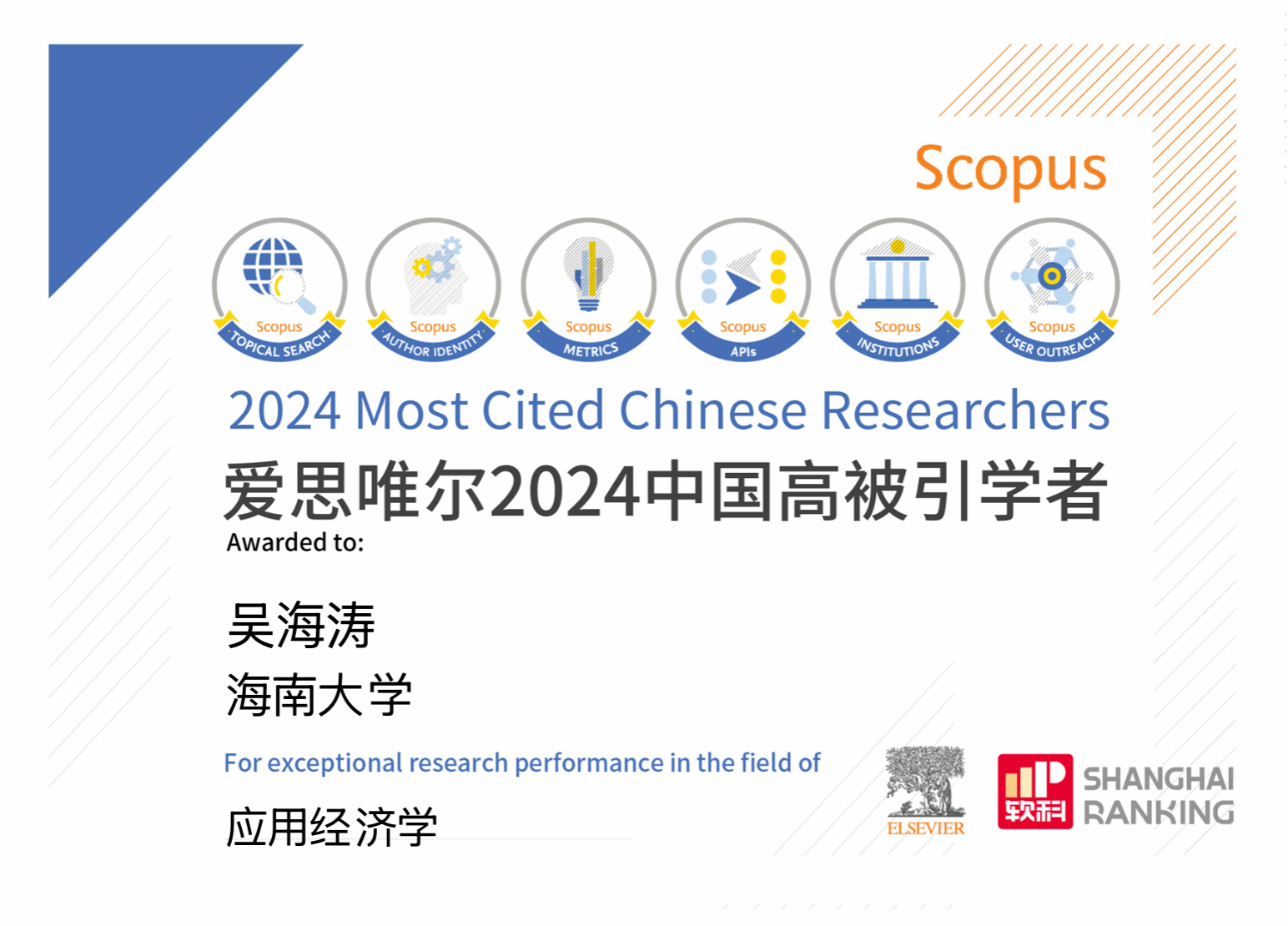 近日,爱思唯尔(Elsevier) 正式发布了2024“中国高被引学者” (Highly Cited Chinese Researchers)榜单。本次上榜共计6388人, 来自547所高校、企业及科研机构,覆盖了10个教育部学科领域中的83门一级学科。公司教师吴海涛、Jahanger Atif(阿提夫)入选“中国高被引学者” 应用经济学学科榜单,彰显英国威廉希尔公司科研实力与学术影响力的持续提升,实现英国威廉希尔公司团队建设和高水平人才队伍建设的新突破。