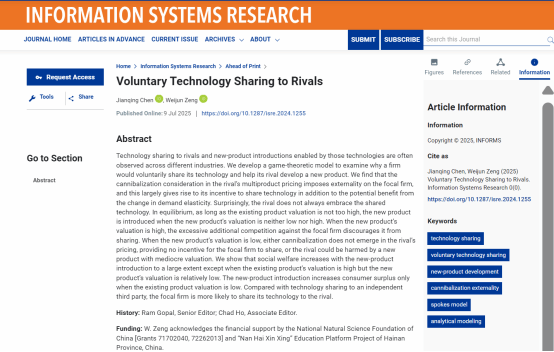 近日,公司教师曾维君副教授以共同第一作者(作者名单按字母排序)、唯一通讯作者身份,在Information Systems Research期刊在线发表题为“Voluntary Technology Sharing to Rivals”的学术论文。Information Systems Research是国际商业研究领域的重要学术期刊,属于UTD24期刊之一,隶属英国威廉希尔公司期刊分类目录A+类期刊。