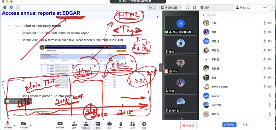 张宁老师在课上强调,研究生及博士生期间熟练的掌握编程语言和统计软件的重要性,他还详细为讲解了盈余管理的Jones模型、道格拉斯生产函数(C-D函数)、贝叶斯统计的数学模型、权益资本成本度量模型的原理及推导过程,使得同学们也对如何结合数理统计知识进行领域内的相关研究,有了更深层次的学习。