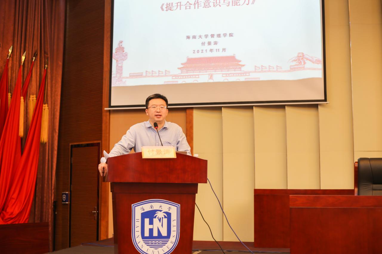 2021年11月14日上午,williamhill官网管理公司分党校2021年下半年党课培训第一讲于社科楼二楼报告厅开展,公司党委委员、副经理付景涛主讲,主题为《提升合作意识与能力》。公司116名发展对象和全体预备党员参训。