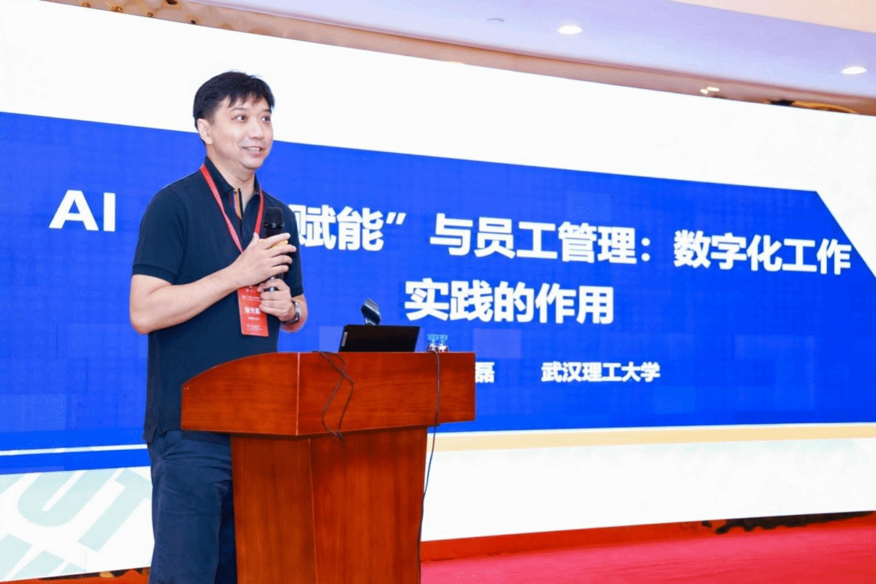武汉理工大学管理公司张光磊教授以“AI‘双向赋能’与员工管理:数字化工作实践的作用”为主题进行了报告。张光磊教授围绕承担的国家自然科学基金重点课题深入阐述了立项背景及核心问题,分享了五个子课题的研究内容。