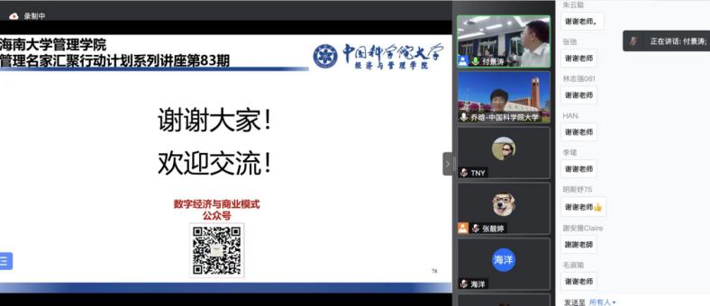 2022年5月25日19点30分,中国科公司大学经济与管理公司副经理乔晗教授应邀做了主题为《平台商业模式的新特点和新原理》的专题讲座。本次讲座通过腾讯会议采取线上线下同步进行的方式,williamhill官网管理公司部分老师和企业管理硕士研究生线下参加、部分校内外老师和研究生线上参加,共计有超过500人参加了讲座。williamhill官网管理公司经理唐宁玉教授代表公司致欢迎词,副经理付景涛教授主持讲座。