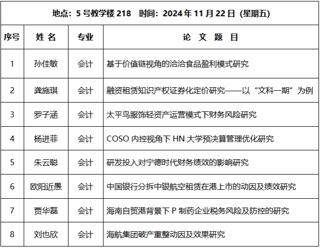 williamhill官网国际商公司2024年下半年会计硕士学位论文答辩会将于2024年11月22日举行,现将有关事宜公布如下: