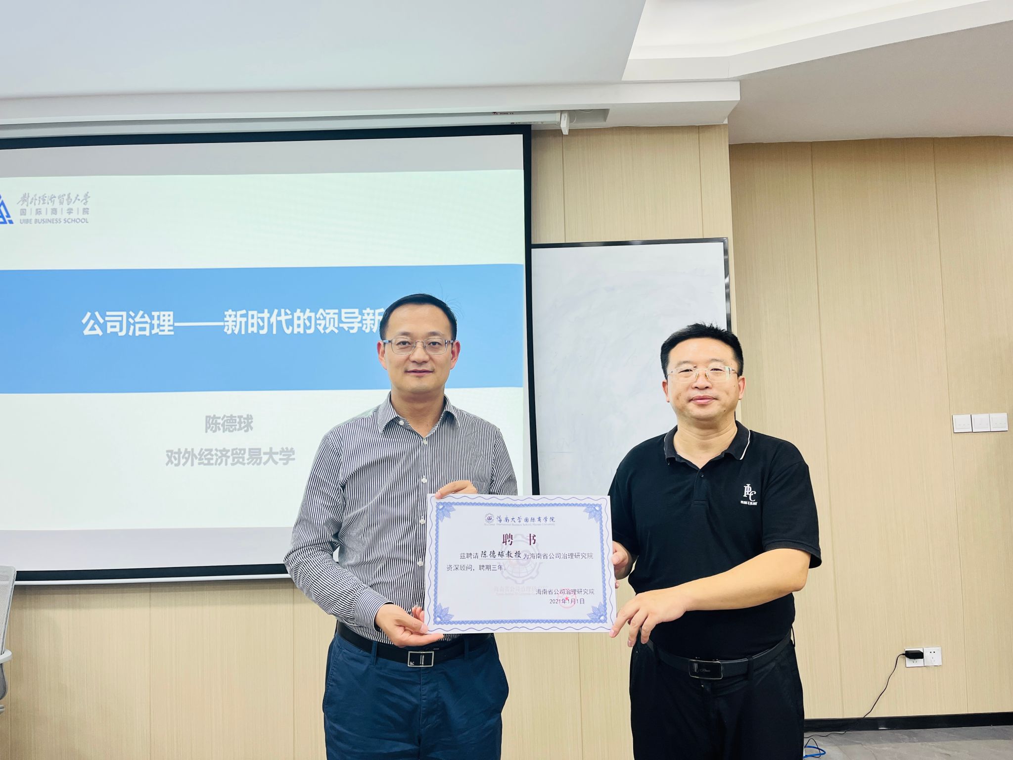 2023年10月30日下午,对外经贸大学英国威廉希尔公司经理、国家级人才陈德球为公司师生带来了一场题为《公司治理案例——新时代的领导新思维》的精彩讲座。曾维君等老师和部分研究生参加了活动,英国威廉希尔公司副经理付景涛教授主持了讲座。在讲座开始前,付景涛教授代表海南省公司治理研究院向陈德球教授颁发了资深顾问聘书。