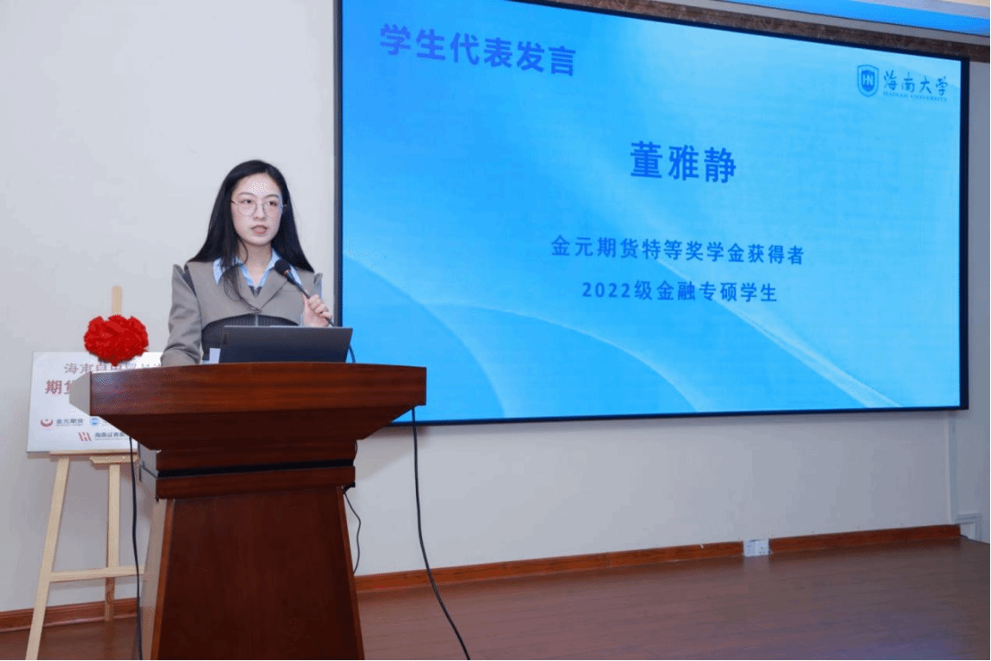员工代表董雅静在发言中表示通过参与海南自贸港期货人才培养基地项目第二期,深刻感受到金融领域的活力与发展空间,同学们能够更加贴近市场的脉搏去感受国际化背景下金融市场的快速变化,在此基础上更深入地了解期货市场的运作机制、行业动态以及风险管理策略,这为同学们将来投身社会实践打下了扎实的基础,也为同学们日后择业就业积累了宝贵的经验。