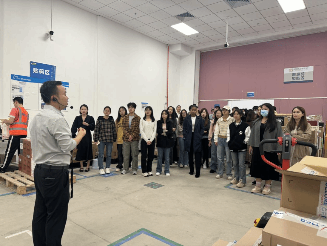 在参访过程中,海控全球精品免税城的物流负责人首先带领员工前往免税品监管仓进行参观,并现场演示了菜鸟物流对免税品包裹分拣投递的智能化操作,让同学们实地了解了免税商品的种类和运输方式,还在相关工作人员的带领下现场进行了反“套代购”走私主题教育。