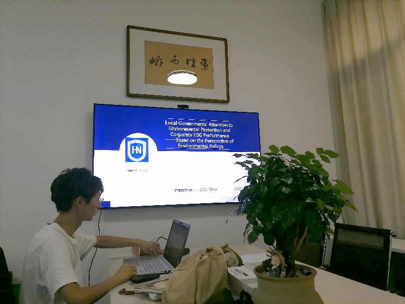 硕士研究生邹四海进行主题汇报,内容为地方环保注意力与企业的ESG表现。主要就该项研究的背景、研究方法、作用机制、研究结果和启示进行分享。不同于以往的论文分享,本次的汇报采用全英文形式,与会人员通过英语进行学术交流。工商管理专业博士研究生Amina(巴基斯坦职工)分别就ESG表现的数据来源和论文的解释模型两个议题与会上的老师和同学们进行了深入的探讨。讨论之后,黎青松老师作总结与陈述,为本次交流活动画上了圆满的句号。